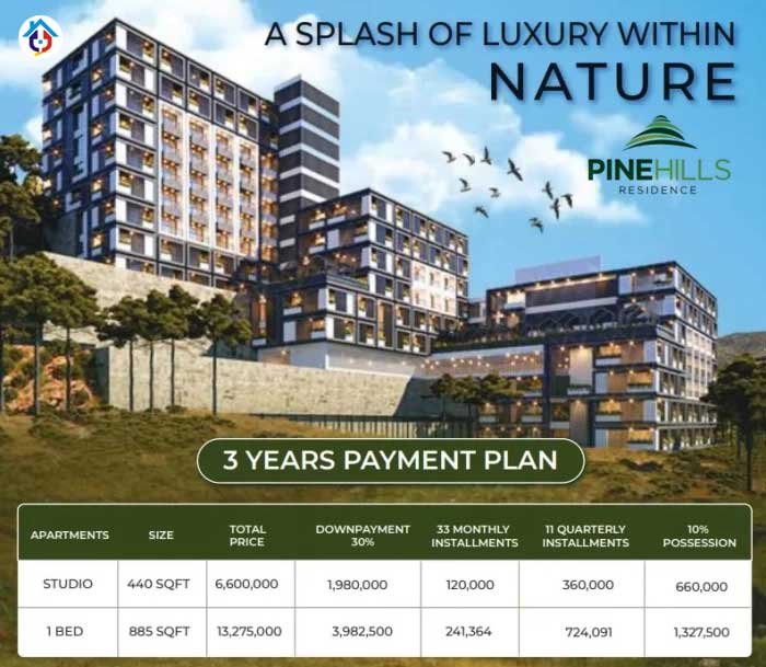 Pine Hills Residence is a one-of-a-kind residential development located in Haripur District's Khanpur, Makhniyal area within the beautiful location of Pine Woods. A breath-taking residential space nestled among the lovely Pine Trees that offers tranquility amidst nature. Pine Hills Residence is a resort complex with breathtaking views of the surrounding area. With a gated community, 24-hour private security system, hospitality services, and state-of-the-art facilities you will have the experience of the ultimate residential bliss. The fully furnished and serviced studio and 1-bedroom apartments offer luxury lounging space and modern kitchenette design. The balcony space that overlooks unique views is perfect for relaxation. The development offers a 7% return on investment per annum from handover, and there's a 10% booking discount and 20 days of free yearly stay. The installment plan is over 30 months, and there's a 10% down payment.